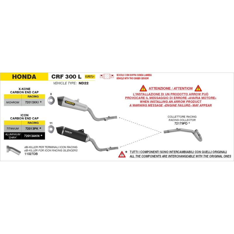 pot d’échappement ARROW ICON racing non homologué pour votre moto HONDA CRF 300 L se monte directement sur votre collecteur d'origine ou arrow afin de composer votre ligne d'échappement