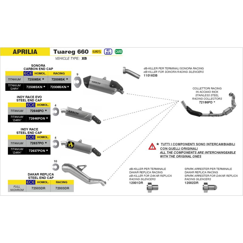 Pot d'échappement ARROW homologué pour APRILIA 660 TUAREG se monte directement sur le collecteur d'origine ou avec l'option collecteur arrow racing afin de composer votre ligne d'échappement