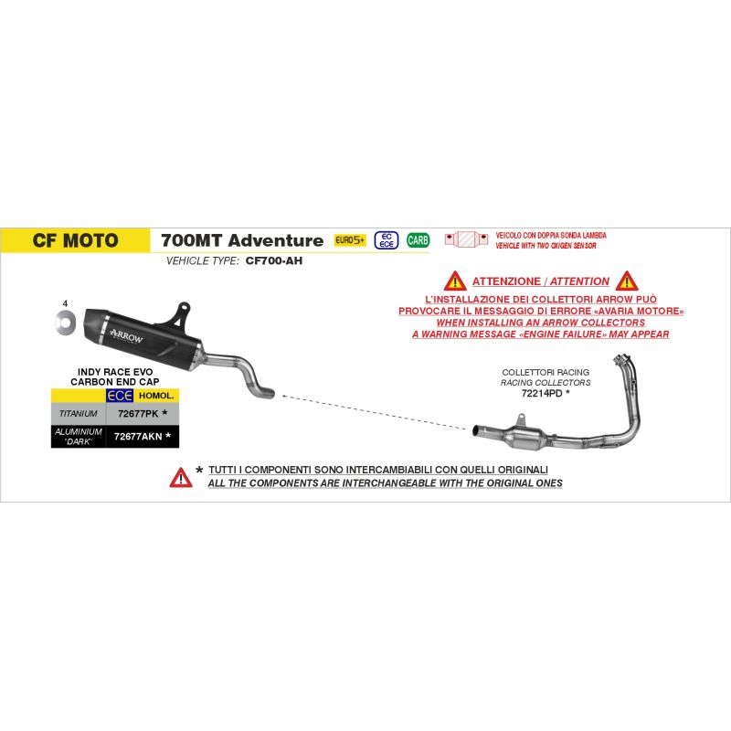 pot d'Échappement ARROW en différente finition homologué pour CF MOTO MT 700 ADVENTURE se monte directement sur le collecteur d'origine ou arrow afin de composer votre ligne d'échappement