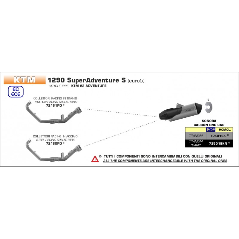 Échappement ARROW SONORA homologué Euro 5 ou racing pour KTM 1290 SUPER ADVENTURE se fixe directement sur collecteur d'origine ou arrow afin de composer votre ligne d'échappement.