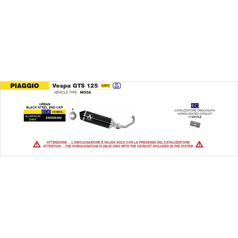 pot d'Échappement ARROW URBAN pour scooter VESPA GTS 125 à commander avec l'option catalyseur pour l’homologation