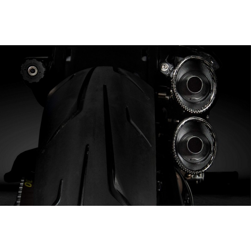 Conçu pour redéfinir l’identité de ce power cruiser moderne, il est fabriqué en acier inoxydable AISI 304, cette ligne présente des silencieux ovales et profilés avec des embouts en fibre de carbone coupé en diagonale, ajoutant ainsi une touche sportive et élégante.